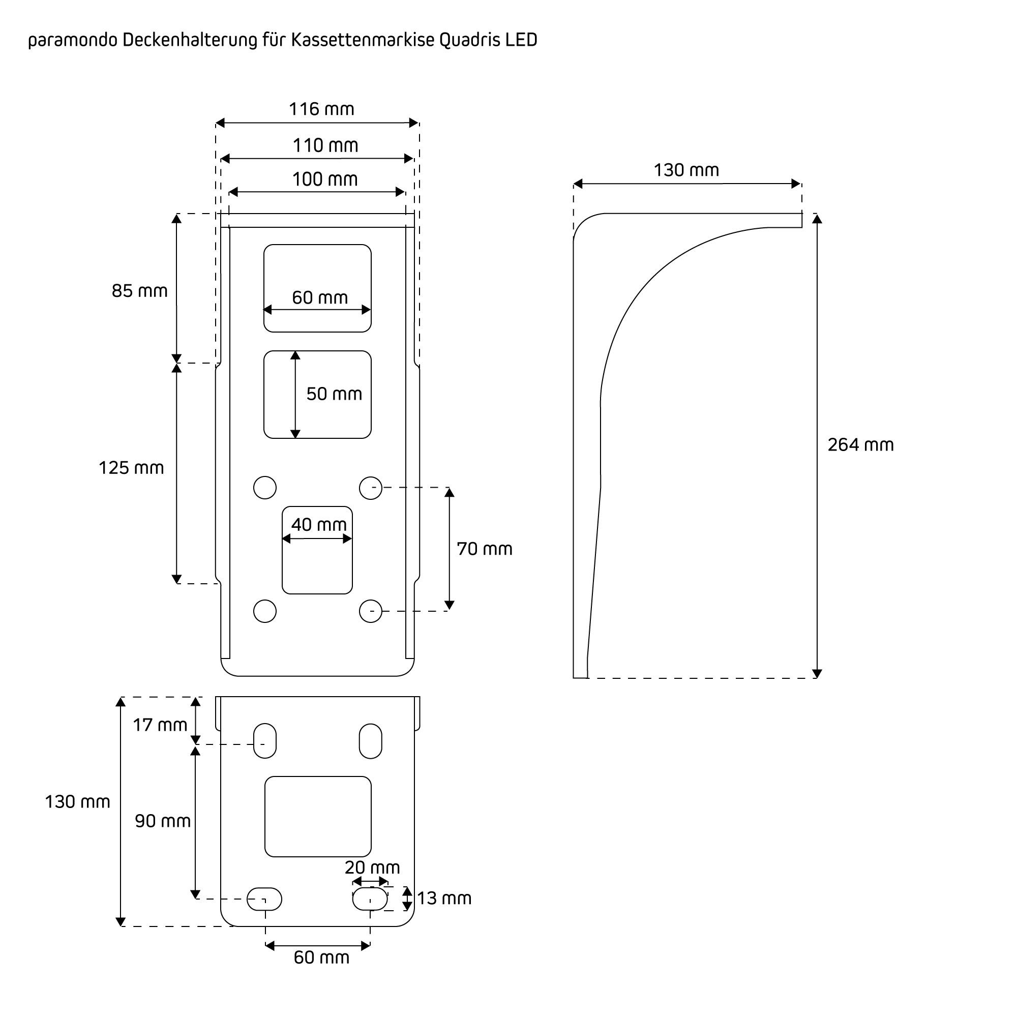 Mit der Deckenhalterung montierst du deine Kassettenmarkise Quadris an der Decke. Sie dient als Basis für die originale Wandhalterung. Die Wandhalterungen sind bereits im Lieferumfang der Quadris enthalten. Die notwendigen Verbindungsschrauben, um die Wandhalterung mit der Deckenhalterung zu verbinden, sind ebenfalls im Lieferumfang enthalten.