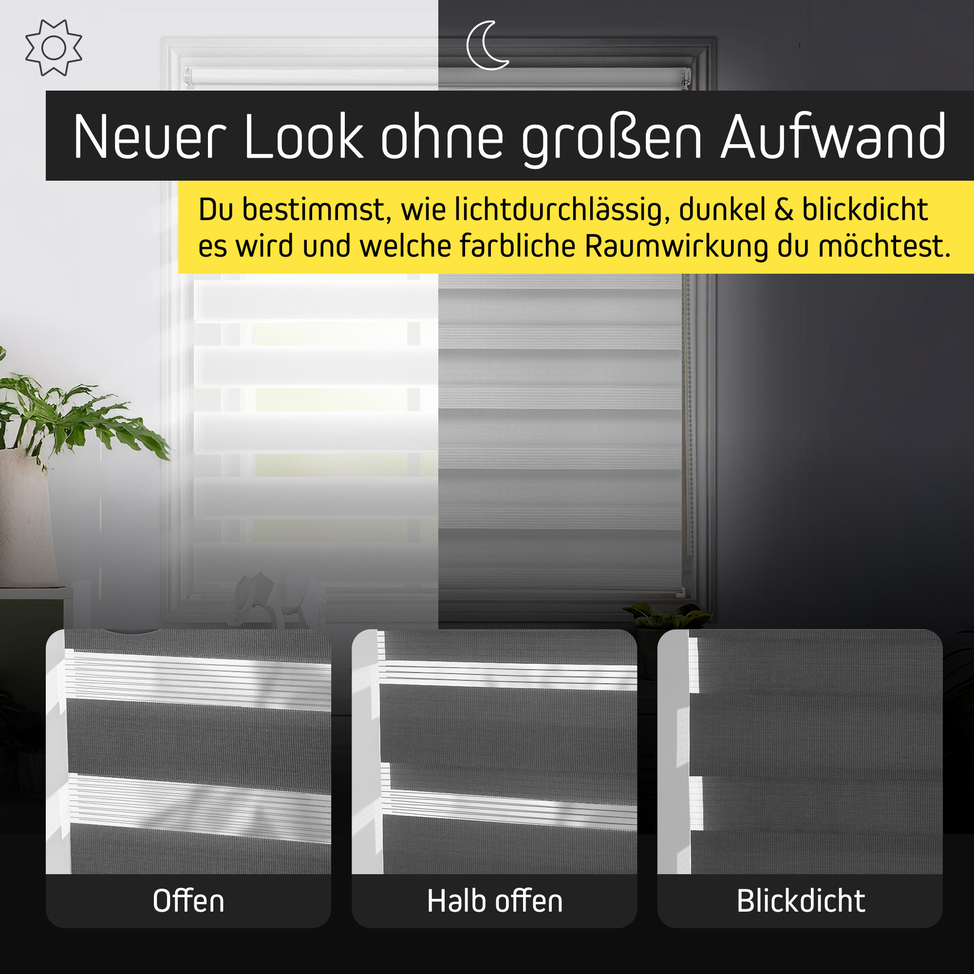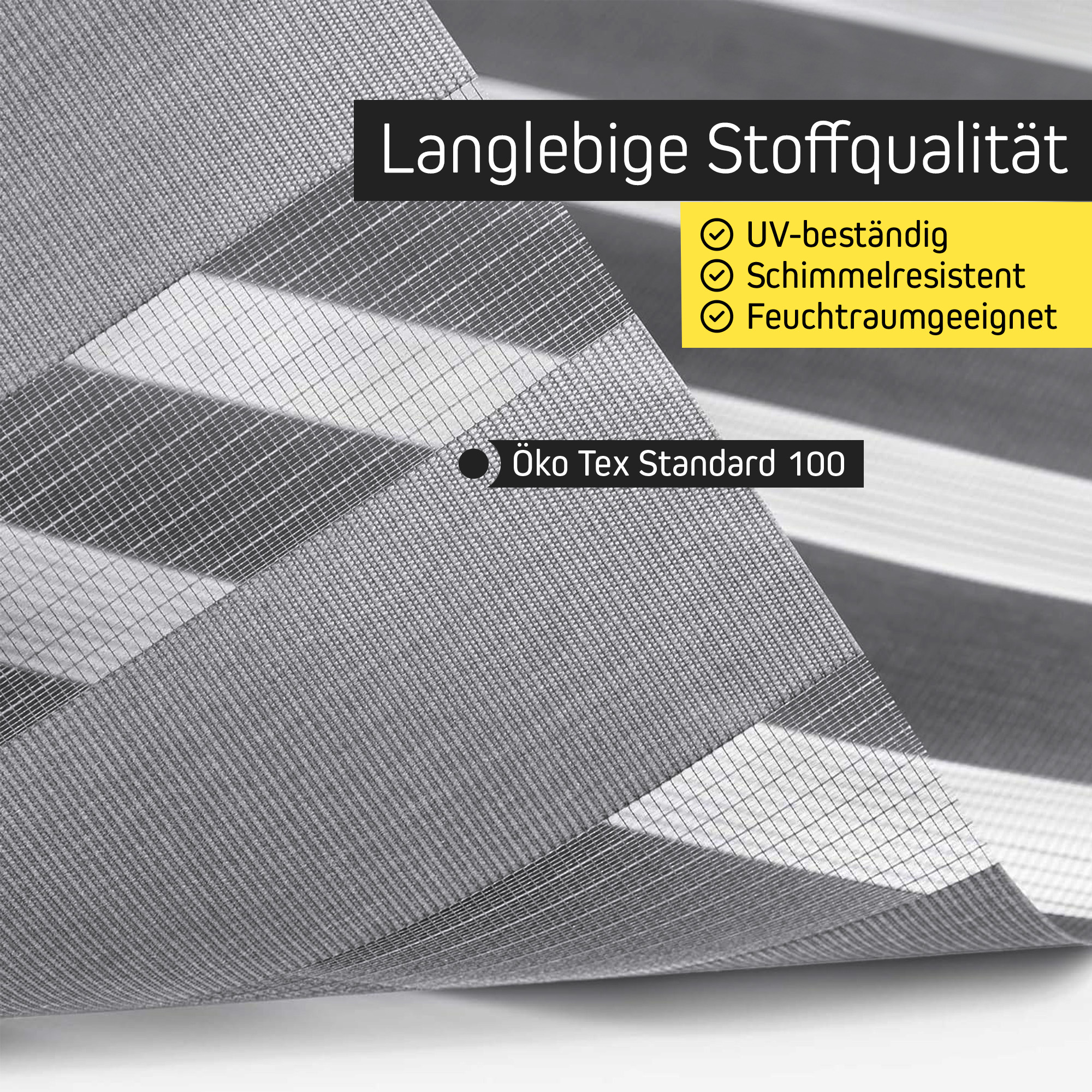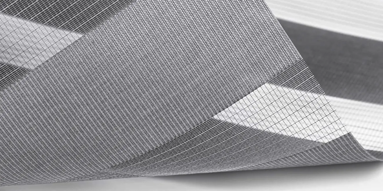 Unser Doppelrollostoff ist aus abwechselnd blickdichten und transparenten Streifen gewebt. Durch geschicktes Verschieben dieser Streifen lässt sich der Lichteinfall ganz nach Wunsch variieren.