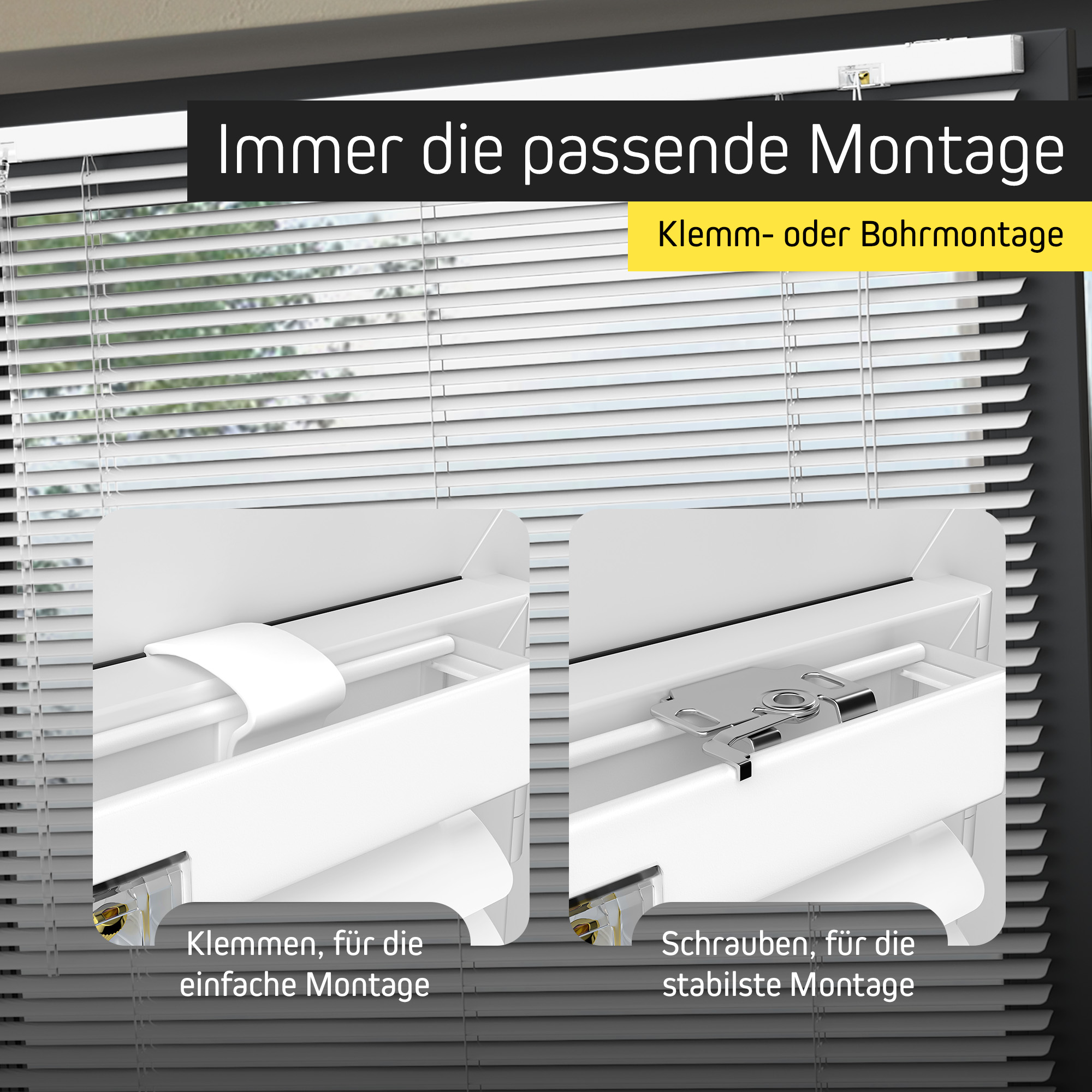Du kannst die Aluminium-Jalousie entweder mit Schrauben befestigen oder mithilfe von Klemmclips montieren, ohne zu bohren. Das entsprechende Material ist im Lieferumfang enthalten. Optional kannst du auch eine Montage mit Klemm- und Klebeträgern wählen.