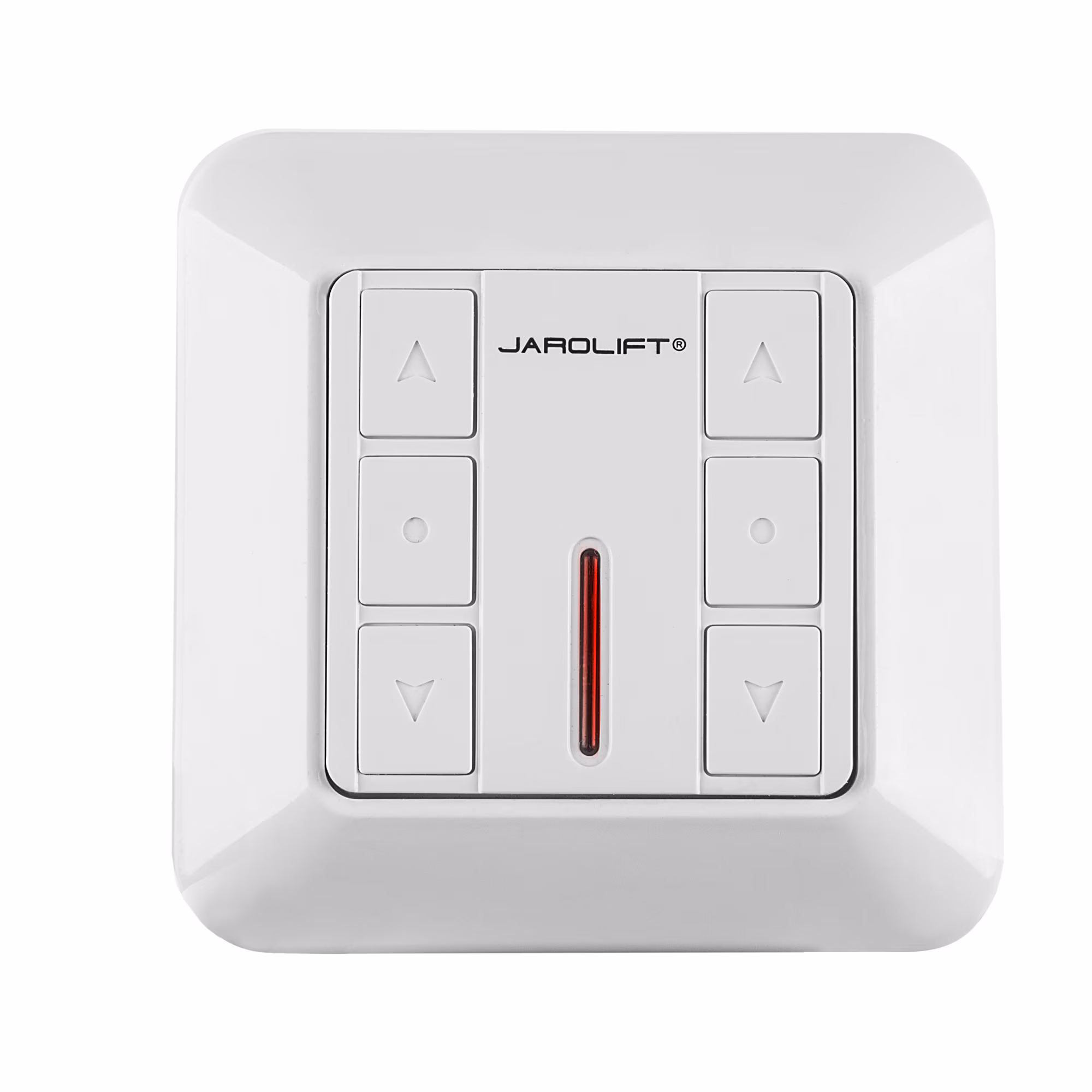 Mit unseren JAROLIFT®™ Funk-Wandsendern kannst du alle JAROLIFT®™ TDEF Funkmotoren sowie Funkempfänger vom Typ TDRR fernbedienen. Zudem können an allen TDEF Funkmotoren auch die Endpunkte einprogrammiert werden. Die in edlem Design hergestellten Funkwandsender der TDRC-Serie werden mit einem passenden Einfachrahmen ausgeliefert. Das Funkmodul wird im Rahmen mit Hilfe eines unsichtbaren Magneten festgehalten. Dadurch kannst du das Funkmodul aus dem Einzelrahmen entfernen, es als mobilen Handsender nutzen und später einfach wieder einsetzen. Das Funkmodul wurde in den Maßen 50 x 50 mm gehalten und lässt sich dank eines DIN Zwischenrahmen in alle gängigen Schalterprogramme wie z.B. Gira, Merten, Busch u. Jaeger, Kopp, etc. integrieren. Das kontrastreiche Display und die roten LED Markierungen runden das hochwertige, zeitlose Design ab.