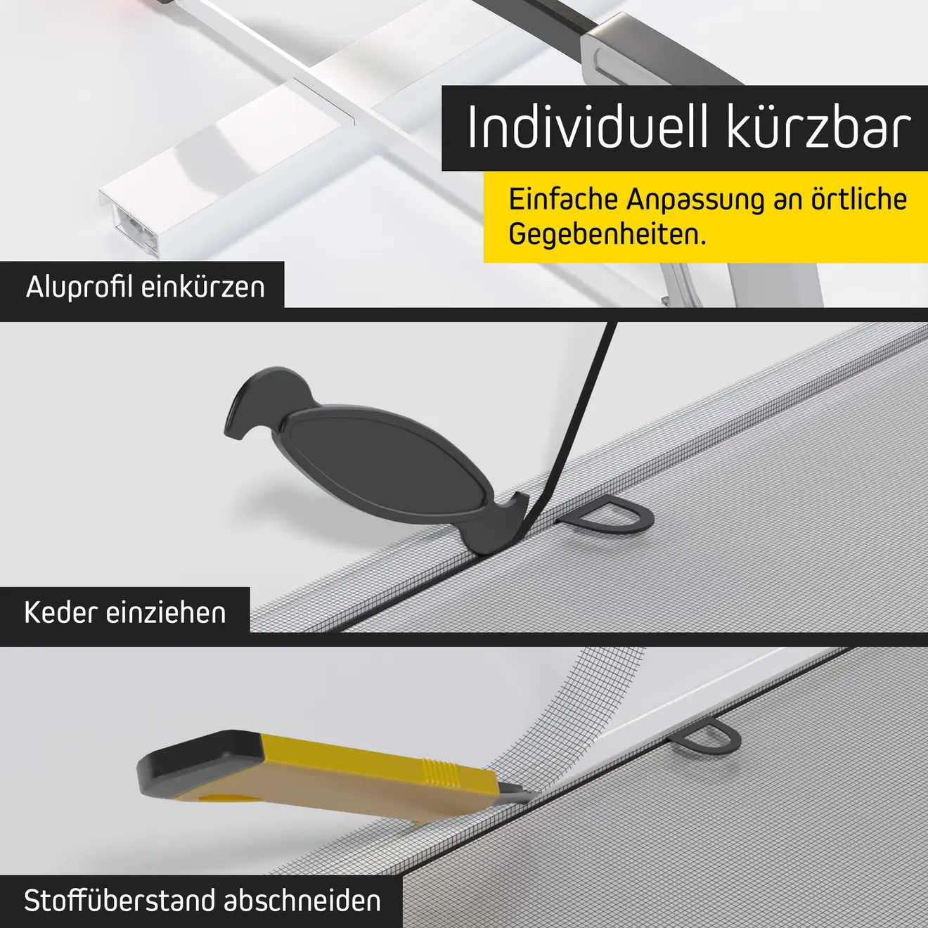 Das Kederwerkzeug zur Fixierung des Fiberglasgewebes im Rahmenprofil ist bereits inbegriffen. Für das Kürzen und die Montage empfehlen wir folgendes Werkzeug: Kunststoffhammer, Eisensäge, Stift, Feile, Teppichmesser, Akkuschrauber, Gehrungslehre, Meterstab oder Maßband, Schere, Anschlagwinkel.