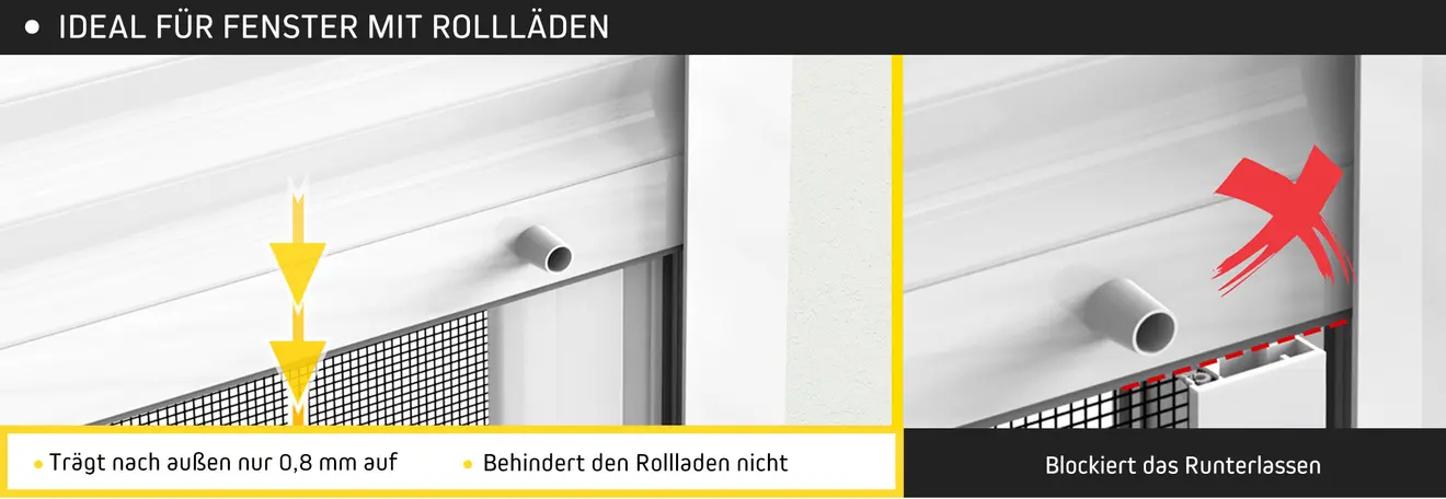 Das Fliegengitter lässt sich durch die seitliche Bürstendichtung direkt in die Fensteröffnung klemmen. Dadurch trägt es bei ausreichender Rahmenstärke nicht auf und blockiert vorhandene Rollläden nicht. Mit Klammern fixiert sitzt es locker, aber dicht. Selbstverständlich kannst du das Fenster auch nach der Montage wie gewohnt öffnen und schließen.