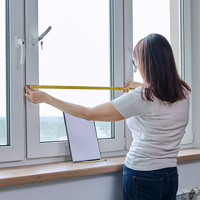 Person misst Fensterrahmen mit Maßband für Insektenschutzinstallation