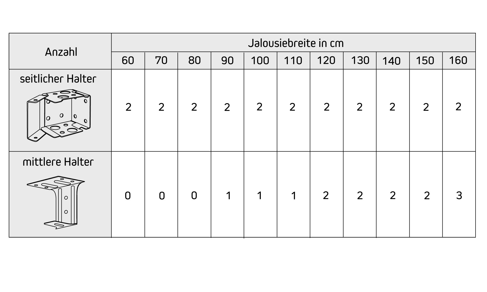 Im Lieferumfang enthalten sind die Jalousie in der gewünschten Farbe, alle benötigten Montageträger, Schnurwickler für die Kindersicherung, Endleistenhalter sowie die hochwertige Blende mit Halterungen.