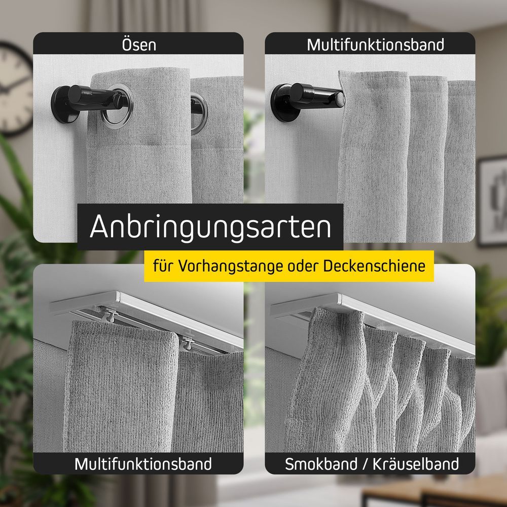| Aufhängungsart: | Kräuselband, Multifunktionsband, smokeband, Ösen |