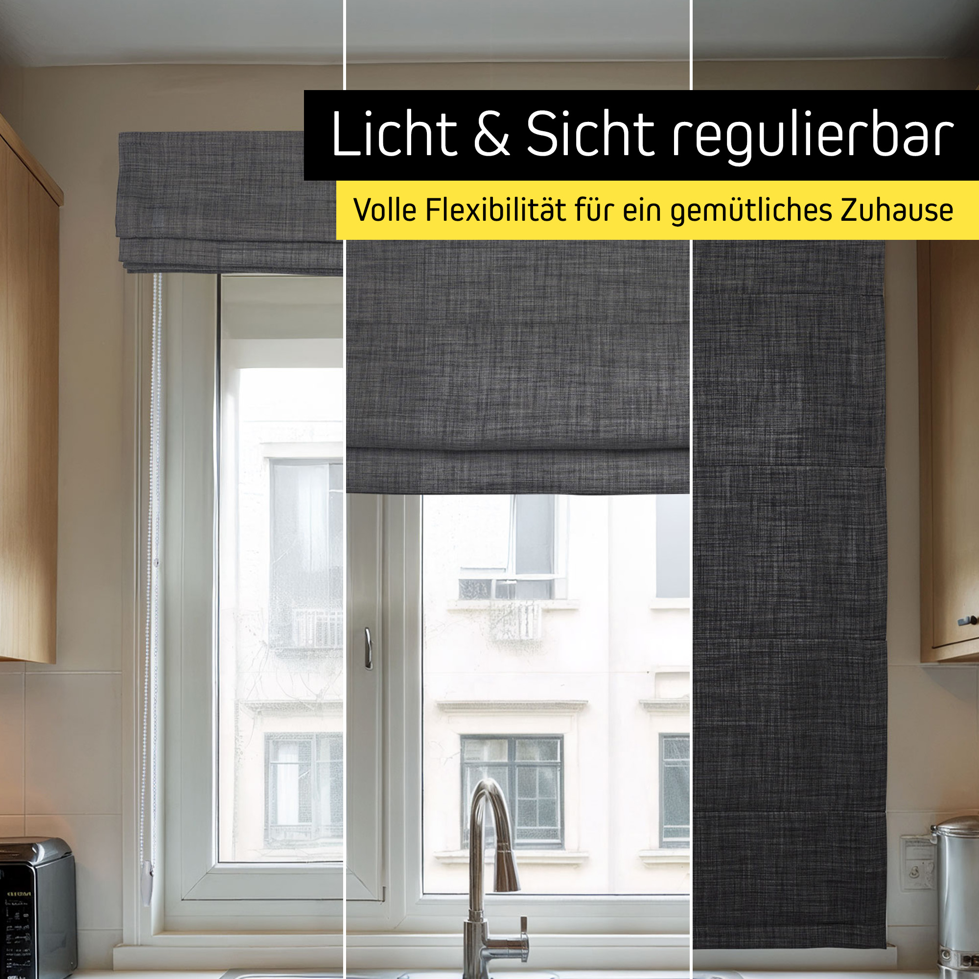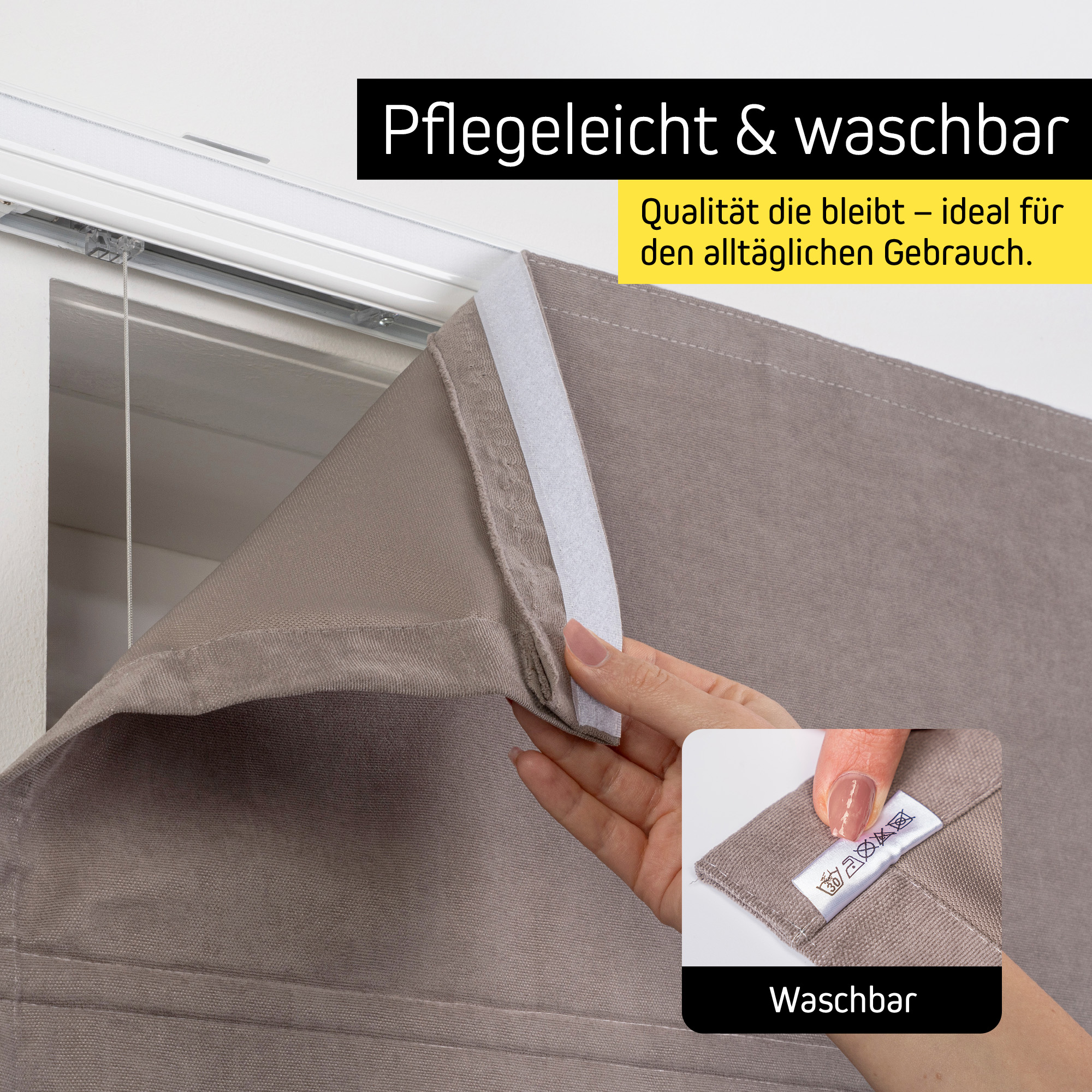 Das stabile Aluminiumprofil und der leichtgängige Kettenzug sorgen für eine komfortable Bedienung und langlebige Qualität. Gleichzeitig überzeugt der Stoff mit einer eleganten Struktur und deinen Fenstern eine moderne, wohnliche Optik verleiht. Der Stoff ist per Klettverschluss leicht abnehmbar und einfach zu waschen – ideal für den alltäglichen Gebrauch.